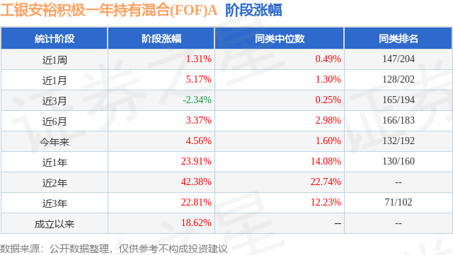 从业绩表现来看,工银安裕积极一年持有混合(FOF)A基金过去一年净值涨幅为23.91%,在同类基金中排名130/160,同类基金过去一年净值涨幅中位数为14.08%。而基金过去一年的最大回撤为-13.32%,成立以来的最大回撤为-26.64%。
