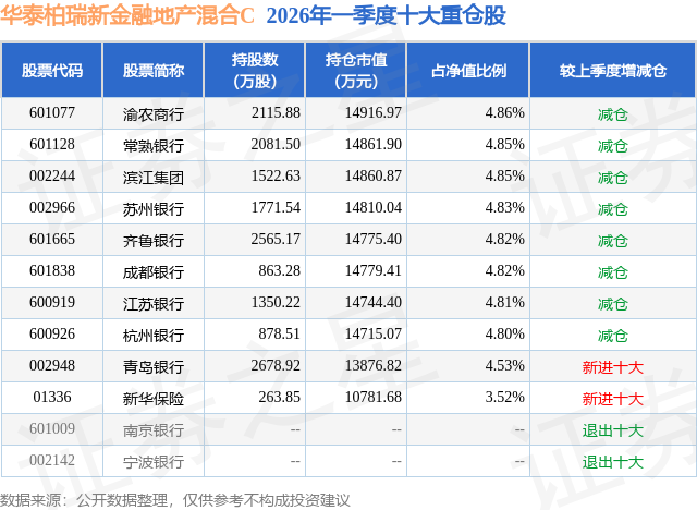 从基金规模来看,华泰柏瑞新金融地产混合C基金2026年一季度公布的基金规模为16.42亿元,较上一期规模12.71亿元变化了3.71亿元,环比变化了29.15%。该基金最新一期资产配置为:股票占净值比94.49%,债券占净值比3.29%,现金占净值比3.25%。从基金持仓来看,该基金当季前十大股票仓位达46.69%,第一大重仓股为渝农商行(601077),持仓占比为4.86%。