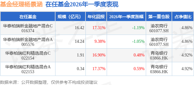 证券之星消息,日前华泰柏瑞新金融地产混合C基金公布一季报,2026年一季度最新规模16.42亿元,季度净值涨幅为-1.19%。