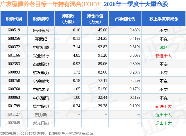 从基金规模来看,广发稳健养老目标一年持有混合(FOF)Y基金2026年一季度公布的基金规模为0.95亿元,较上一期规模5608.3万元变化了3900.51万元,环比变化了69.55%。该基金最新一期资产配置为:股票占净值比2.79%,债券占净值比4.37%,现金占净值比2.08%。从基金持仓来看,该基金当季前十大股票仓位达2.7%,第一大重仓股为贵州茅台(600519),持仓占比为0.48%。