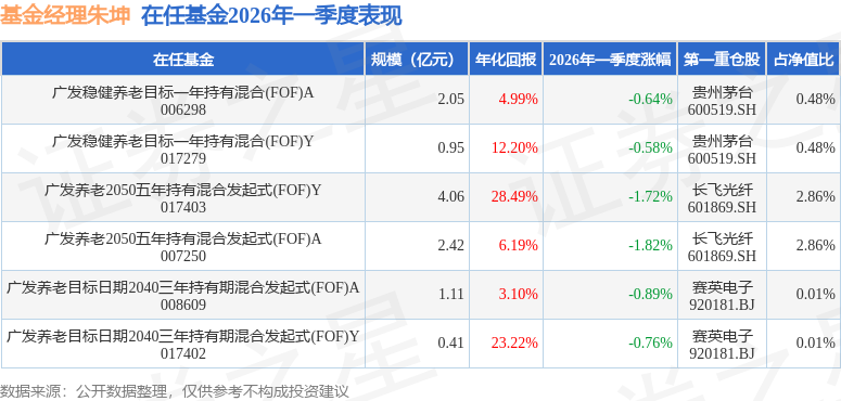 证券之星消息,日前广发稳健养老目标一年持有混合(FOF)Y基金公布一季报,2026年一季度最新规模0.95亿元,季度净值涨幅为-0.58%。