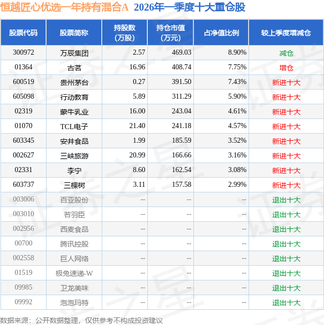 从基金规模来看,恒越匠心优选一年持有混合A基金2026年一季度公布的基金规模为0.3亿元,较上一期规模7052.88万元变化了-4066.89万元,环比变化了-57.66%。该基金最新一期资产配置为:股票占净值比84.92%,无债券类资产,现金占净值比16.66%。从基金持仓来看,该基金当季前十大股票仓位达51.91%,第一大重仓股为万辰集团(300972),持仓占比为8.9%。