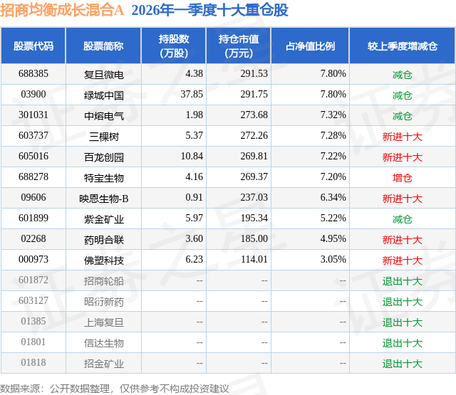 从基金规模来看,招商均衡成长混合A基金2026年一季度公布的基金规模为0.34亿元,较上一期规模7478.04万元变化了-4048.3万元,环比变化了-54.14%。该基金最新一期资产配置为:股票占净值比80.27%,债券占净值比7.05%,现金占净值比16.0%。从基金持仓来看,该基金当季前十大股票仓位达64.18%,第一大重仓股为复旦微电(688385),持仓占比为7.8%。