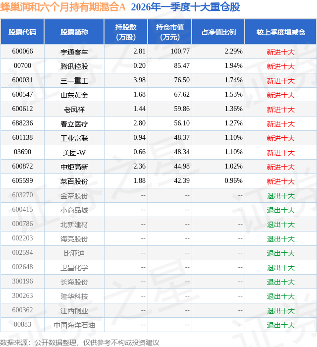 从基金规模来看,蜂巢润和六个月持有期混合A基金2026年一季度公布的基金规模为0.2亿元,较上一期规模1665.15万元变化了383.93万元,环比变化了23.06%。该基金最新一期资产配置为:股票占净值比27.81%,债券占净值比59.92%,现金占净值比15.79%。从基金持仓来看,该基金当季前十大股票仓位达14.31%,第一大重仓股为宇通客车(600066),持仓占比为2.29%。