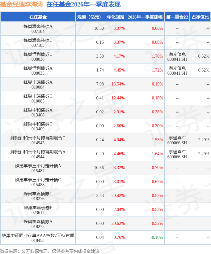 证券之星消息,日前蜂巢润和六个月持有期混合A基金公布一季报,2026年一季度最新规模0.2亿元,季度净值涨幅为1.64%。