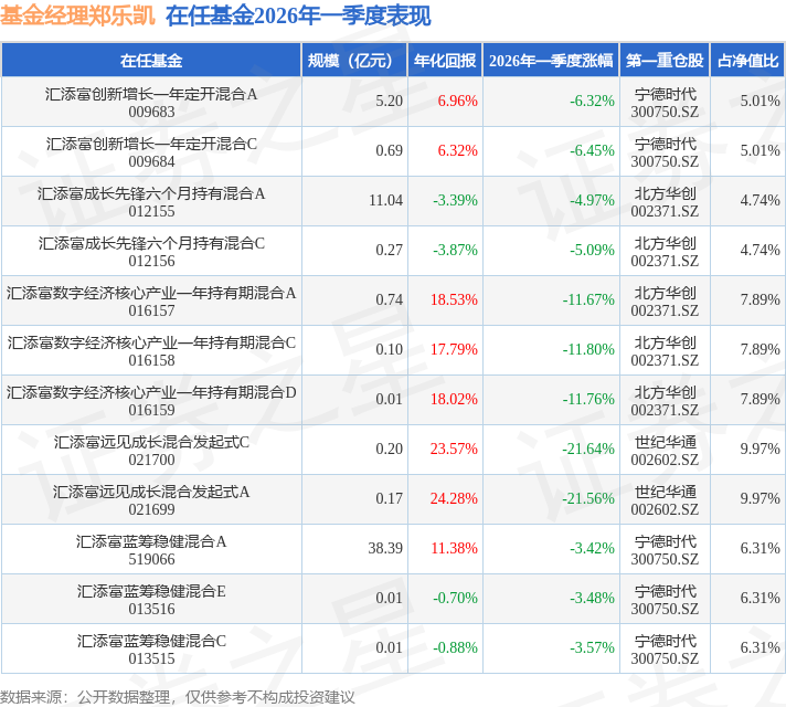 证券之星消息,日前汇添富数字经济核心产业一年持有期混合D基金公布一季报,2026年一季度最新规模0.01亿元,季度净值涨幅为-11.76%。
