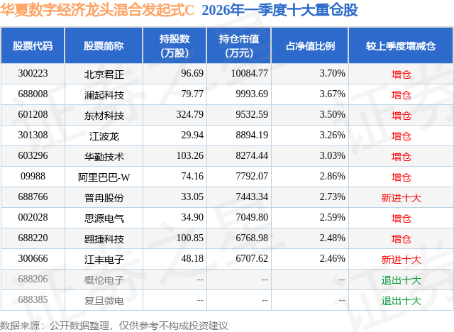 从基金规模来看,华夏数字经济龙头混合发起式C基金2026年一季度公布的基金规模为15.67亿元,较上一期规模2.14亿元变化了13.53亿元,环比变化了632.74%。该基金最新一期资产配置为:股票占净值比92.96%,无债券类资产,现金占净值比7.93%。从基金持仓来看,该基金当季前十大股票仓位达30.28%,第一大重仓股为北京君正(300223),持仓占比为3.7%。