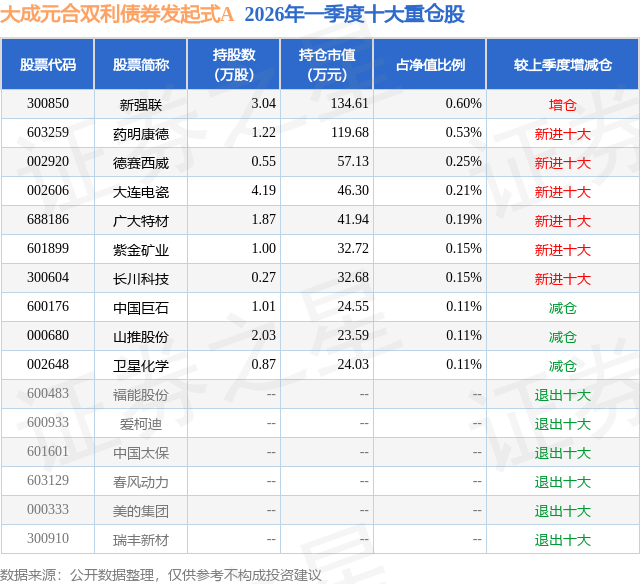 从基金规模来看,大成元合双利债券发起式A基金2026年一季度公布的基金规模为2.23亿元,较上一期规模2.15亿元变化了808.99万元,环比变化了3.76%。该基金最新一期资产配置为:股票占净值比2.61%,债券占净值比94.95%,现金占净值比2.65%。从基金持仓来看,该基金当季前十大股票仓位达2.41%,第一大重仓股为新强联(300850),持仓占比为0.6%。