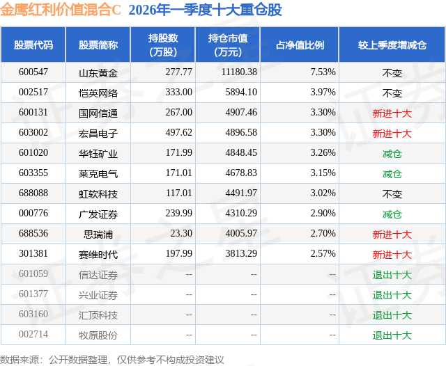 从基金规模来看,金鹰红利价值混合C基金2026年一季度公布的基金规模为2.48亿元,较上一期规模2.61亿元变化了-1363.14万元,环比变化了-5.22%。该基金最新一期资产配置为:股票占净值比75.69%,债券占净值比10.88%,现金占净值比12.99%。从基金持仓来看,该基金当季前十大股票仓位达35.7%,第一大重仓股为山东黄金(600547),持仓占比为7.53%。