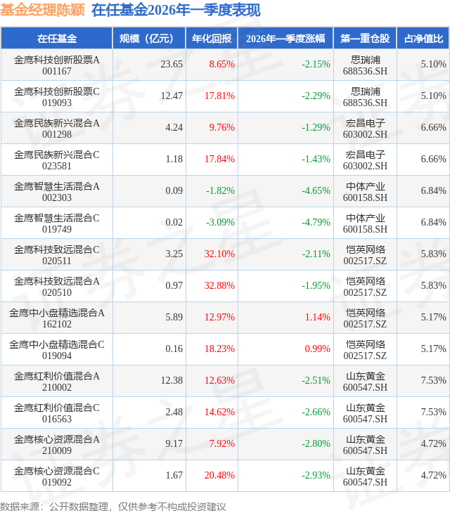 证券之星消息,日前金鹰红利价值混合C基金公布一季报,2026年一季度最新规模2.48亿元,季度净值涨幅为-2.66%。