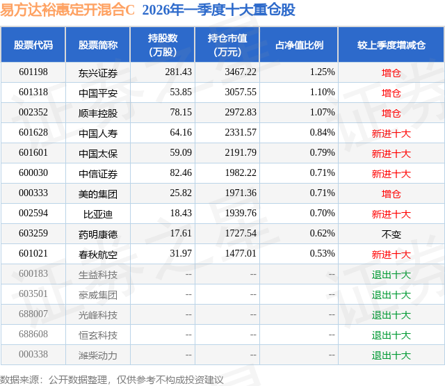 证券之星消息,日前易方达裕惠定开混合C基金公布一季报,2026年一季度最新规模1.13亿元,季度净值涨幅为-0.24%。