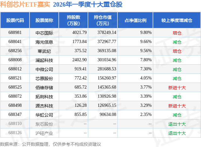 从基金规模来看,科创芯片ETF嘉实基金2026年一季度公布的基金规模为386.07亿元,较上一期规模396.58亿元变化了-10.51亿元,环比变化了-2.65%。该基金最新一期资产配置为:股票占净值比99.95%,无债券类资产,现金占净值比0.21%。从基金持仓来看,该基金当季前十大股票仓位达60.97%,第一大重仓股为中芯国际(688981),持仓占比为9.8%。
