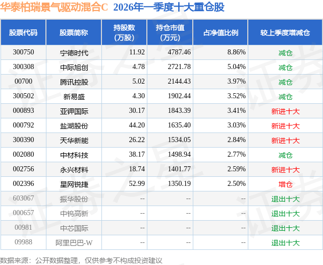 从基金规模来看,华泰柏瑞景气驱动混合C基金2026年一季度公布的基金规模为2.87亿元,较上一期规模2.17亿元变化了6985.52万元,环比变化了32.19%。该基金最新一期资产配置为:股票占净值比89.28%,无债券类资产,现金占净值比10.09%。从基金持仓来看,该基金当季前十大股票仓位达38.53%,第一大重仓股为宁德时代(300750),持仓占比为8.86%。