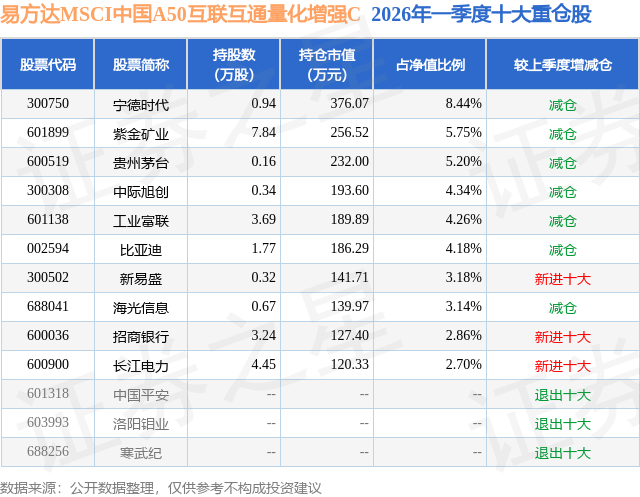 从基金规模来看,易方达MSCI中国A50互联互通量化增强C基金2026年一季度公布的基金规模为0.07亿元,较上一期规模1092.63万元变化了-371.72万元,环比变化了-34.02%。该基金最新一期资产配置为:股票占净值比93.31%,无债券类资产,现金占净值比6.77%。从基金持仓来看,该基金当季前十大股票仓位达44.05%,第一大重仓股为宁德时代(300750),持仓占比为8.44%。