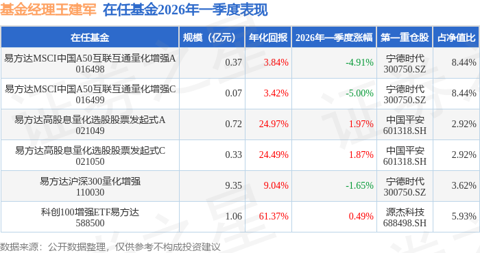 证券之星消息,日前易方达MSCI中国A50互联互通量化增强C基金公布一季报,2026年一季度最新规模0.07亿元,季度净值涨幅为-5.0%。
