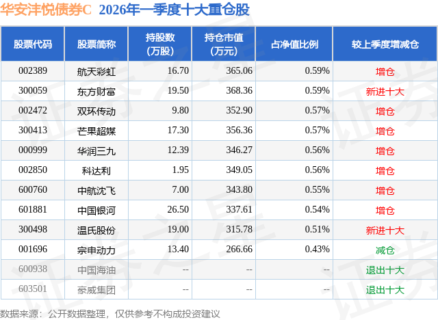 从基金规模来看,华安沣悦债券C基金2026年一季度公布的基金规模为1.75亿元,较上一期规模452.87万元变化了1.71亿元,环比变化了3771.43%。该基金最新一期资产配置为:股票占净值比10.05%,债券占净值比86.16%,现金占净值比0.75%。从基金持仓来看,该基金当季前十大股票仓位达5.47%,第一大重仓股为航天彩虹(002389),持仓占比为0.59%。