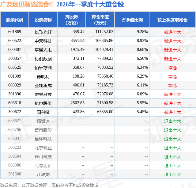 从基金规模来看,广发远见智选混合C基金2026年一季度公布的基金规模为106.55亿元,较上一期规模1.02亿元变化了105.54亿元,环比变化了10357.6%。该基金最新一期资产配置为:股票占净值比93.15%,无债券类资产,现金占净值比7.92%。从基金持仓来看,该基金当季前十大股票仓位达69.61%,第一大重仓股为长飞光纤(601869),持仓占比为9.28%。