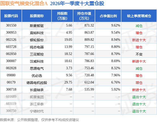 从基金规模来看,国联安气候变化混合A基金2026年一季度公布的基金规模为0.86亿元,较上一期规模8493.53万元变化了88.5万元,环比变化了1.04%。该基金最新一期资产配置为:股票占净值比92.12%,无债券类资产,现金占净值比57.39%。从基金持仓来看,该基金当季前十大股票仓位达83.25%,第一大重仓股为斯菱智驱(301550),持仓占比为9.62%。