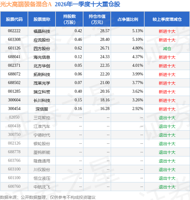 证券之星消息,日前光大高端装备混合A基金公布一季报,2026年一季度最新规模0.02亿元,季度净值涨幅为-4.0%。