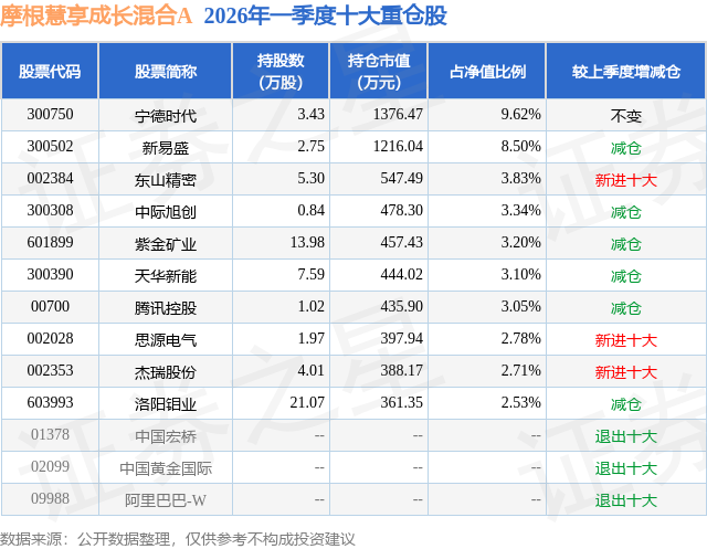 证券之星消息,日前摩根慧享成长混合A基金公布一季报,2026年一季度最新规模0.59亿元,季度净值涨幅为-2.14%。