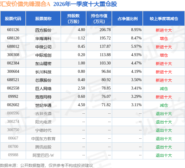 证券之星消息,日前汇安价值先锋混合A基金公布一季报,2026年一季度最新规模0.21亿元,季度净值涨幅为-11.71%。