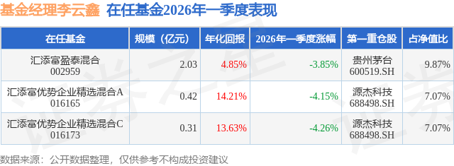 证券之星消息,日前汇添富优势企业精选混合A基金公布一季报,2026年一季度最新规模0.42亿元,季度净值涨幅为-4.15%。