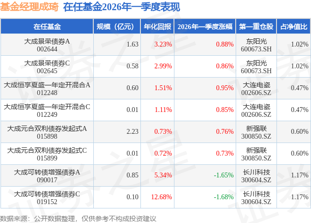 证券之星消息,日前大成元合双利债券发起式C基金公布一季报,2026年一季度最新规模0.01亿元,季度净值涨幅为0.73%。