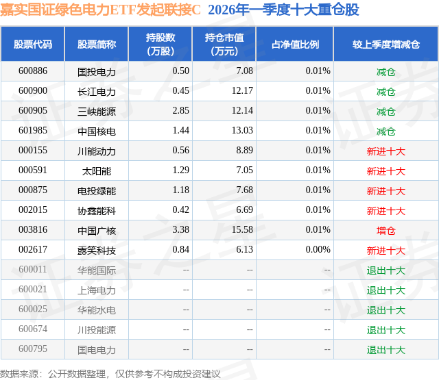 从基金规模来看,嘉实国证绿色电力ETF发起联接C基金2026年一季度公布的基金规模为11.72亿元,较上一期规模6582.39万元变化了11.06亿元,环比变化了1680.22%。该基金最新一期资产配置为:股票占净值比0.14%,无债券类资产,现金占净值比7.38%。从基金持仓来看,该基金当季前十大股票仓位达0.09%,第一大重仓股为国投电力(600886),持仓占比为0.01%。