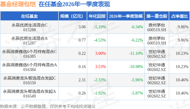 证券之星消息,日前永赢消费鑫选6个月持有混合C基金公布一季报,2026年一季度最新规模0.22亿元,季度净值涨幅为-11.1%。