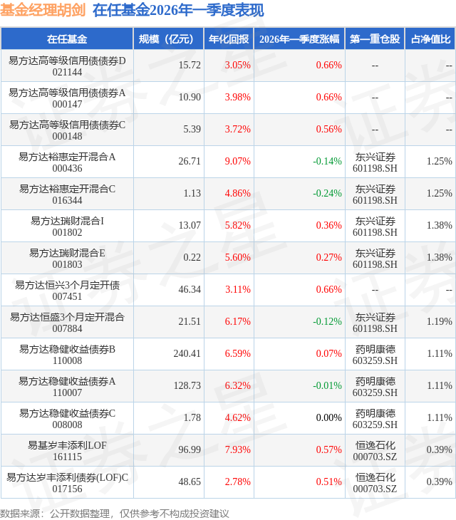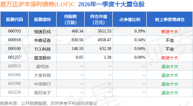 从基金规模来看,易方达岁丰添利债券(LOF)C基金2026年一季度公布的基金规模为48.65亿元,较上一期规模27.04亿元变化了21.62亿元,环比变化了79.95%。该基金最新一期资产配置为:股票占净值比0.77%,债券占净值比110.86%,现金占净值比0.33%。从基金持仓来看,该基金当季前十大股票仓位达0.77%,第一大重仓股为恒逸石化(000703),持仓占比为0.39%。