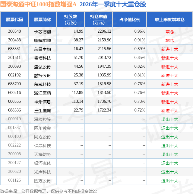 从基金规模来看,国泰海通中证1000指数增强A基金2026年一季度公布的基金规模为11.75亿元,较上一期规模6.66亿元变化了5.09亿元,环比变化了76.46%。该基金最新一期资产配置为:股票占净值比91.48%,无债券类资产,现金占净值比8.59%。从基金持仓来看,该基金当季前十大股票仓位达8.21%,第一大重仓股为长芯博创(300548),持仓占比为0.96%。