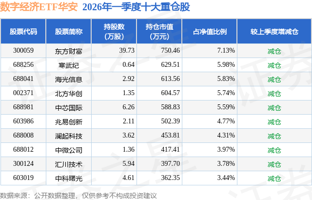 从基金规模来看,数字经济ETF华安基金2026年一季度公布的基金规模为1.05亿元,较上一期规模1.45亿元变化了-3969.08万元,环比变化了-27.38%。该基金最新一期资产配置为:股票占净值比98.32%,无债券类资产,现金占净值比1.99%。从基金持仓来看,该基金当季前十大股票仓位达50.54%,第一大重仓股为东方财富(300059),持仓占比为7.13%。