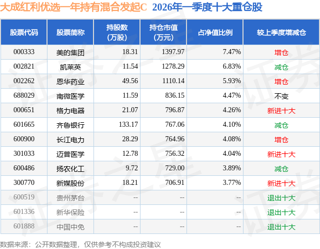 从基金规模来看,大成红利优选一年持有混合发起C基金2026年一季度公布的基金规模为0.86亿元,较上一期规模200.31万元变化了8444.64万元,环比变化了4215.79%。该基金最新一期资产配置为:股票占净值比93.95%,无债券类资产,现金占净值比6.25%。从基金持仓来看,该基金当季前十大股票仓位达48.84%,第一大重仓股为美的集团(000333),持仓占比为7.47%。