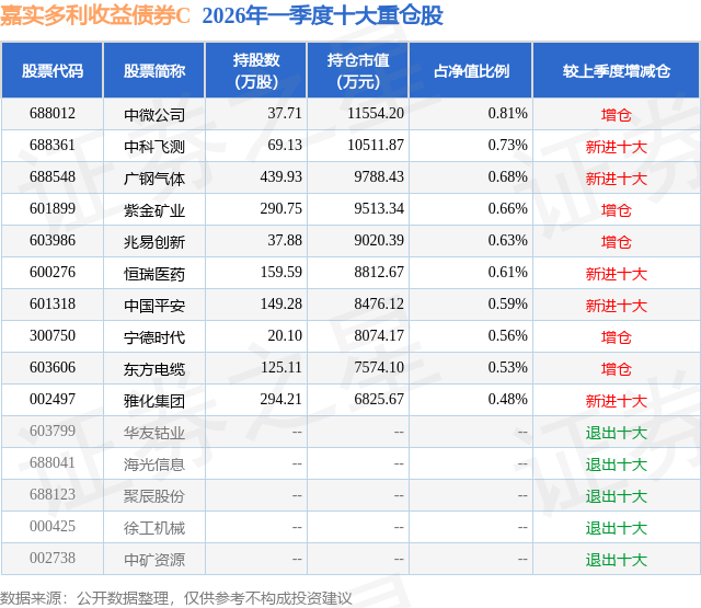 从基金规模来看,嘉实多利收益债券C基金2026年一季度公布的基金规模为52.58亿元,较上一期规模9562.3万元变化了51.62亿元,环比变化了5398.17%。该基金最新一期资产配置为:股票占净值比17.71%,债券占净值比82.21%,现金占净值比1.14%。从基金持仓来看,该基金当季前十大股票仓位达6.28%,第一大重仓股为中微公司(688012),持仓占比为0.81%。
