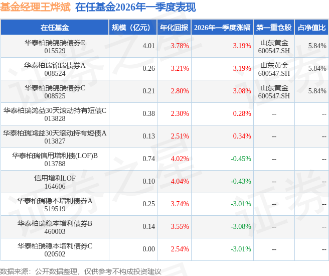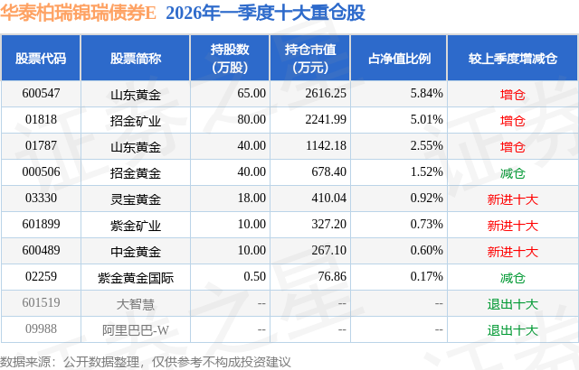 从基金规模来看,华泰柏瑞锦瑞债券E基金2026年一季度公布的基金规模为4.01亿元,较上一期规模7455.43万元变化了3.27亿元,环比变化了438.28%。该基金最新一期资产配置为:股票占净值比17.33%,债券占净值比80.96%,现金占净值比1.8%。从基金持仓来看,该基金当季前十大股票仓位达17.34%,第一大重仓股为山东黄金(600547),持仓占比为5.84%。
