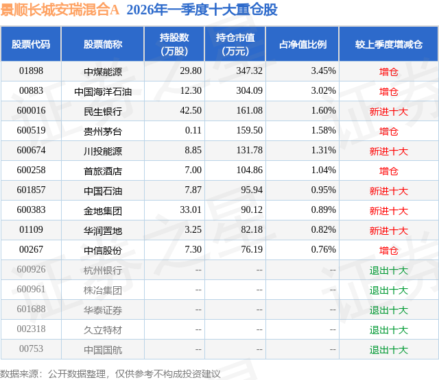 从基金规模来看,景顺长城安瑞混合A基金2026年一季度公布的基金规模为0.69亿元,较上一期规模3180.39万元变化了3749.76万元,环比变化了117.9%。该基金最新一期资产配置为:股票占净值比29.13%,债券占净值比37.67%,现金占净值比8.83%。从基金持仓来看,该基金当季前十大股票仓位达15.42%,第一大重仓股为中煤能源(01898),持仓占比为3.45%。