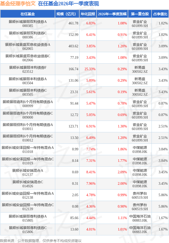 证券之星消息,日前景顺长城安瑞混合A基金公布一季报,2026年一季度最新规模0.69亿元,季度净值涨幅为2.09%。