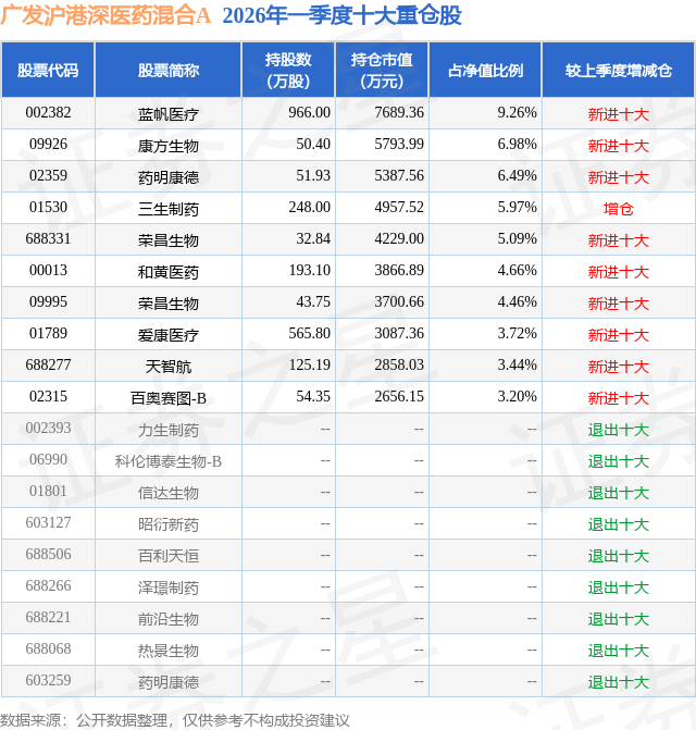 从基金规模来看,广发沪港深医药混合A基金2026年一季度公布的基金规模为1.91亿元,较上一期规模1.76亿元变化了1540.76万元,环比变化了8.76%。该基金最新一期资产配置为:股票占净值比87.42%,无债券类资产,现金占净值比27.44%。从基金持仓来看,该基金当季前十大股票仓位达53.27%,第一大重仓股为蓝帆医疗(002382),持仓占比为9.26%。