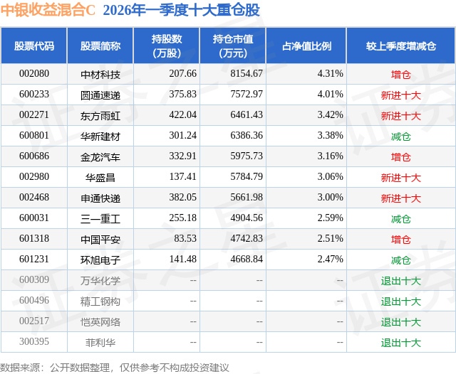 从基金规模来看,中银收益混合C基金2026年一季度公布的基金规模为2.09亿元,较上一期规模4.4亿元变化了-2.31亿元,环比变化了-52.44%。该基金最新一期资产配置为:股票占净值比82.88%,债券占净值比1.36%,现金占净值比14.88%。从基金持仓来看,该基金当季前十大股票仓位达31.91%,第一大重仓股为中材科技(002080),持仓占比为4.31%。