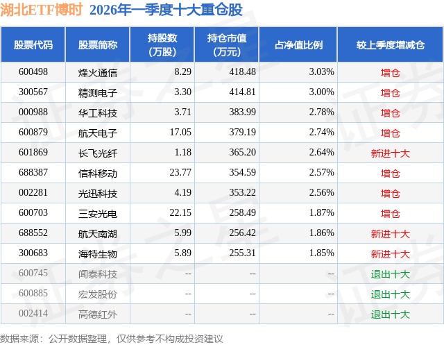 从基金规模来看,湖北ETF博时基金2026年一季度公布的基金规模为1.38亿元,较上一期规模1.31亿元变化了734.68万元,环比变化了5.61%。该基金最新一期资产配置为:股票占净值比98.57%,无债券类资产,现金占净值比2.48%。从基金持仓来看,该基金当季前十大股票仓位达24.9%,第一大重仓股为烽火通信(600498),持仓占比为3.03%。
