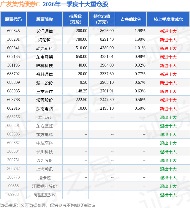 从基金规模来看,广发集悦债券C基金2026年一季度公布的基金规模为22.39亿元,较上一期规模8699.43万元变化了21.52亿元,环比变化了2473.65%。该基金最新一期资产配置为:股票占净值比19.6%,债券占净值比83.71%,现金占净值比1.01%。从基金持仓来看,该基金当季前十大股票仓位达9.92%,第一大重仓股为长江通信(600345),持仓占比为1.98%。