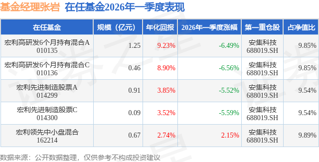 从基金规模来看,宏利先进制造股票A基金2026年一季度公布的基金规模为0.91亿元,较上一期规模1.9亿元变化了-9820.12万元,环比变化了-51.8%。该基金最新一期资产配置为:股票占净值比92.71%,无债券类资产,现金占净值比7.13%。从基金持仓来看,该基金当季前十大股票仓位达80.74%,第一大重仓股为安集科技(688019),持仓占比为9.54%。