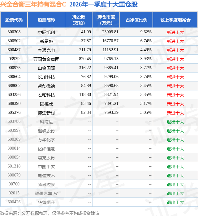 从基金规模来看,兴全合衡三年持有混合C基金2026年一季度公布的基金规模为1.28亿元,较上一期规模3.3亿元变化了-2.02亿元,环比变化了-61.3%。该基金最新一期资产配置为:股票占净值比75.65%,债券占净值比2.85%,现金占净值比9.52%。从基金持仓来看,该基金当季前十大股票仓位达45.31%,第一大重仓股为中际旭创(300308),持仓占比为9.62%。