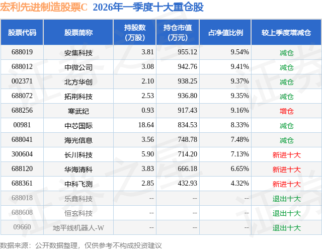 从基金规模来看,宏利先进制造股票C基金2026年一季度公布的基金规模为0.09亿元,较上一期规模897.82万元变化了-19.88万元,环比变化了-2.21%。该基金最新一期资产配置为:股票占净值比92.71%,无债券类资产,现金占净值比7.13%。从基金持仓来看,该基金当季前十大股票仓位达80.74%,第一大重仓股为安集科技(688019),持仓占比为9.54%。
