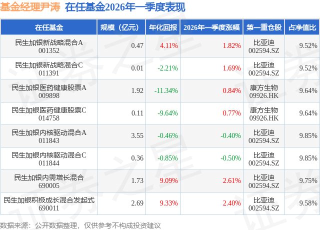证券之星消息,日前民生加银医药健康股票C基金公布一季报,2026年一季度最新规模0.11亿元,季度净值涨幅为0.77%。