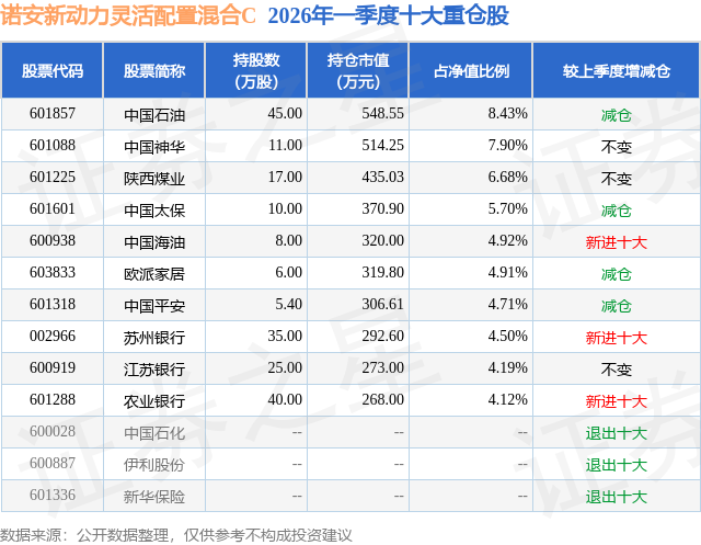 从基金规模来看,诺安新动力灵活配置混合C基金2026年一季度公布的基金规模为0.06亿元,较上一期规模386.18万元变化了186.34万元,环比变化了48.25%。该基金最新一期资产配置为:股票占净值比78.94%,债券占净值比11.62%,现金占净值比9.73%。从基金持仓来看,该基金当季前十大股票仓位达56.06%,第一大重仓股为中国石油(601857),持仓占比为8.43%。