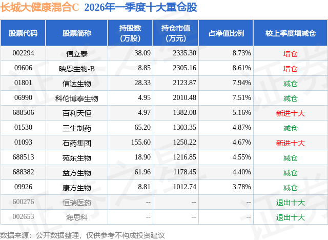 从基金规模来看,长城大健康混合C基金2026年一季度公布的基金规模为1.03亿元,较上一期规模1529.46万元变化了8727.6万元,环比变化了570.63%。该基金最新一期资产配置为:股票占净值比86.1%,无债券类资产,现金占净值比14.49%。从基金持仓来看,该基金当季前十大股票仓位达60.22%,第一大重仓股为信立泰(002294),持仓占比为8.73%。