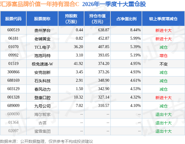 从基金规模来看,汇添富品牌价值一年持有混合C基金2026年一季度公布的基金规模为0.08亿元,较上一期规模1478.31万元变化了-710.19万元,环比变化了-48.04%。该基金最新一期资产配置为:股票占净值比90.43%,无债券类资产,现金占净值比9.79%。从基金持仓来看,该基金当季前十大股票仓位达52.45%,第一大重仓股为贵州茅台(600519),持仓占比为8.44%。