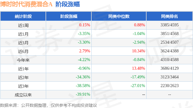 从业绩表现来看,博时时代消费混合A基金过去一年净值涨幅为-4.21%,在同类基金中排名4346/4479,同类基金过去一年净值涨幅中位数为39.3%。而基金过去一年的最大回撤为-17.53%,成立以来的最大回撤为-45.78%。