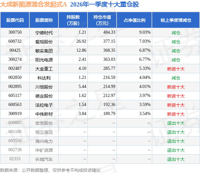 从基金规模来看,大成新能源混合发起式A基金2026年一季度公布的基金规模为0.36亿元,较上一期规模3918.91万元变化了-366.44万元,环比变化了-9.35%。该基金最新一期资产配置为:股票占净值比84.5%,无债券类资产,现金占净值比15.45%。从基金持仓来看,该基金当季前十大股票仓位达54.18%,第一大重仓股为宁德时代(300750),持仓占比为9.03%。